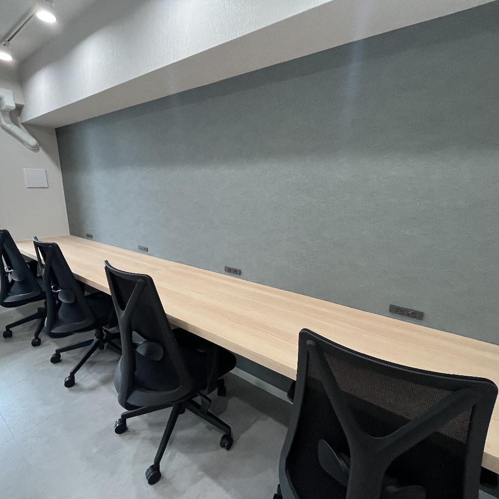 カウンターテーブルは、温もりある木目調。無機質なオフィス家具ではなく、まるでカフェで働いているような、心地よい空間を意識しました。ブラックのメッシュチェアと組み合わせることで、ナチュラルさの中にもきちんと感を添えています。